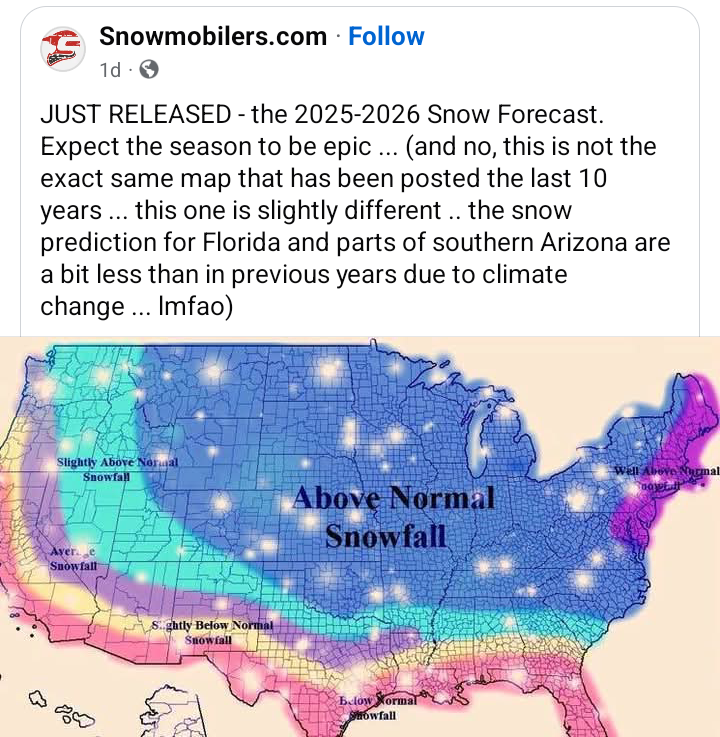Just released – the 2025/26 snow forecast. Expect the season to be epic…and no, this is not the exact same map that has been posted the last 10 years…this one is slightly different…the snow prediction for Florida and parts of southern Arizona are a bit less than in previous years due to climate change…lol)