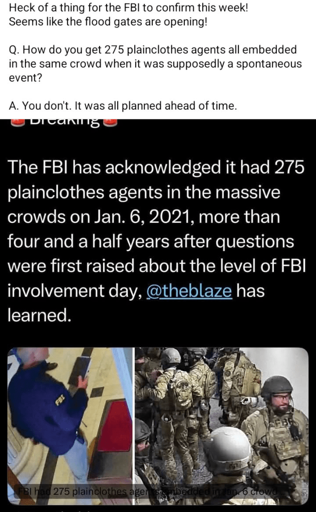 The FBI has acknowledged it had 275 plainclothes agents in the massive crowds on Jan 6, 2021, more than four and a half years after questions were first raised about the level of FBI involvement that day…