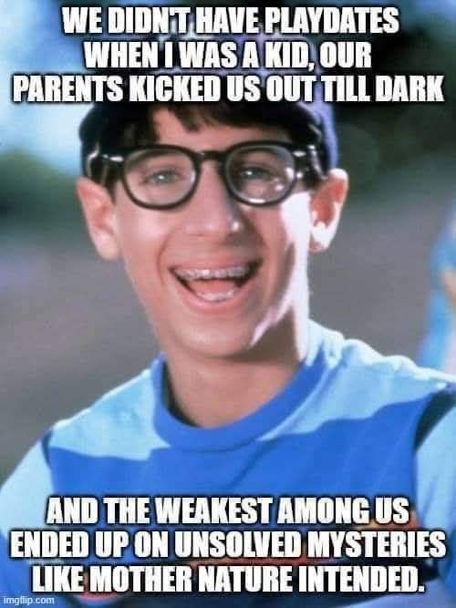 We didn’t have playdates when I was a child, our parents kicked us out until dark, and the weakest among us ended up on Unsolved Mysteries like mother nature intended.