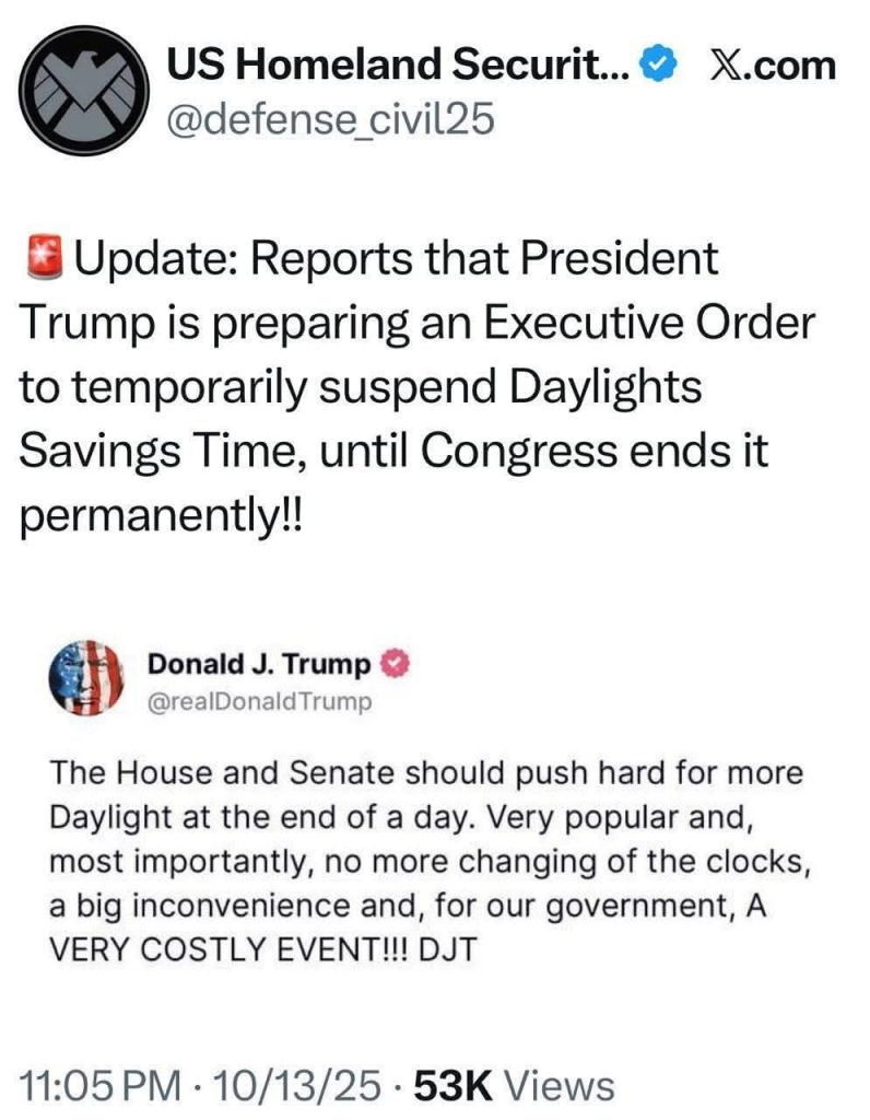 Update: Reports that President Trump is preparing an Executive Order to temporarily suspend Daylights Savings Time until Congress ends it permanently!!