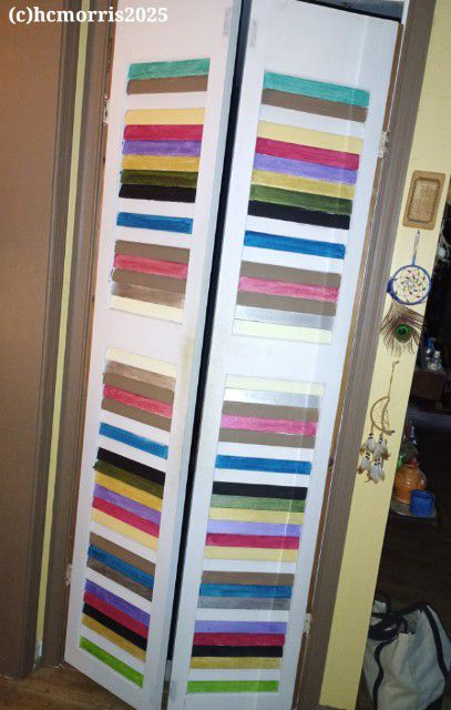 When I put the doors up I knew I wanted to do something with the slats – add a little color to them. Just because. Nothing gaudy, nothing girly …just some color.