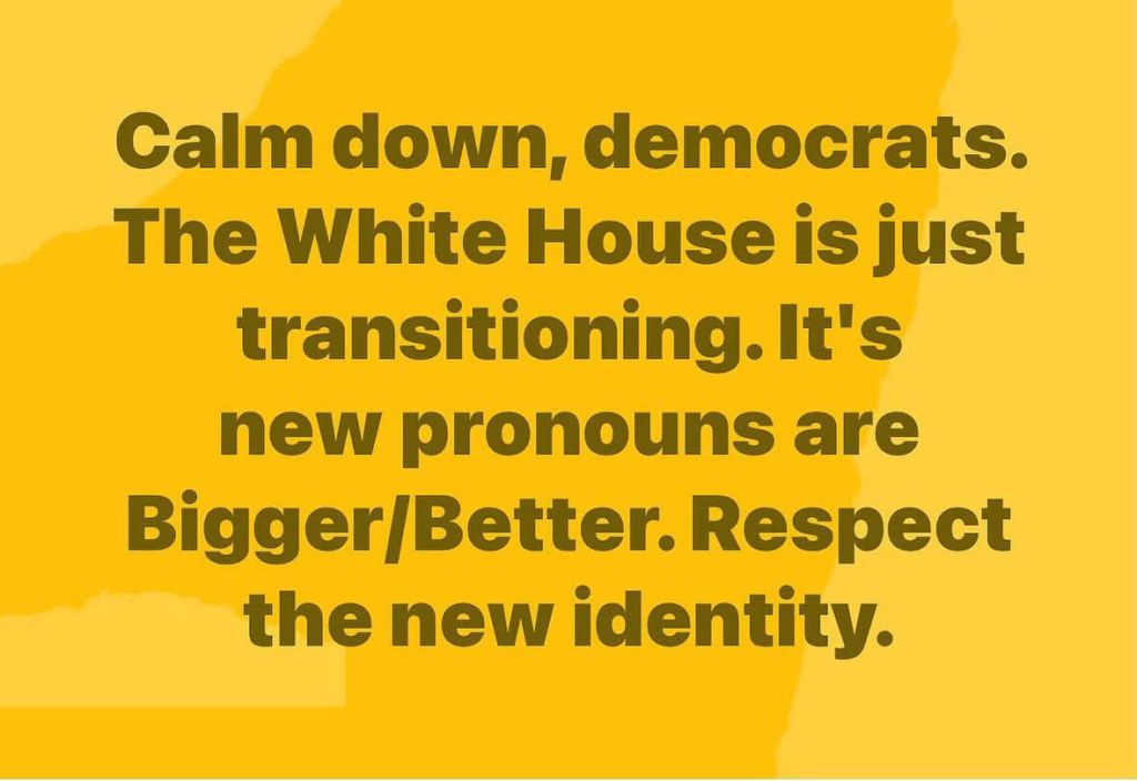 Calm down, Democrats! The White House is just transitioning. It’s new pronouns are Bigger/Better. Respect the new identity.