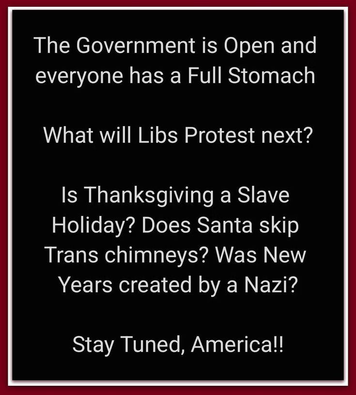 The government is open and everyone has a full stomach. What will Libs protest next? Is Thanksgiving a slave holiday? Does Santa skip trans chimneys? Was New Years created by a Nazi?