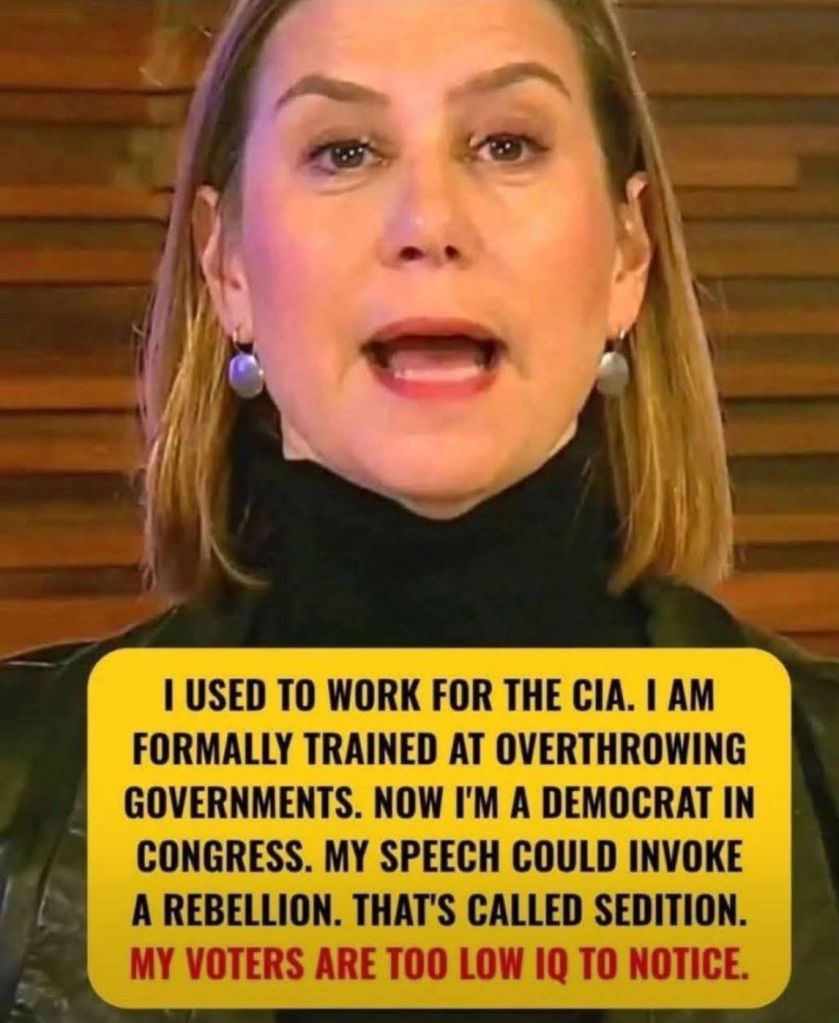 I used to work for the CIA. I am formally trained at overthrowing governments. Now I’m a Democrat in Congress. My speech could invoke a rebellion. That’s called sedition. My voters are too low IQ to notice.