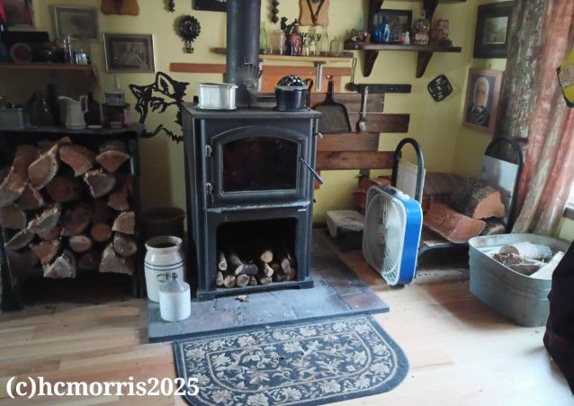 Off camera are a basket and an old coal bucket full of fire starters – bark, sticks, and small chunks of wood, that I use to get a fresh fire going.
