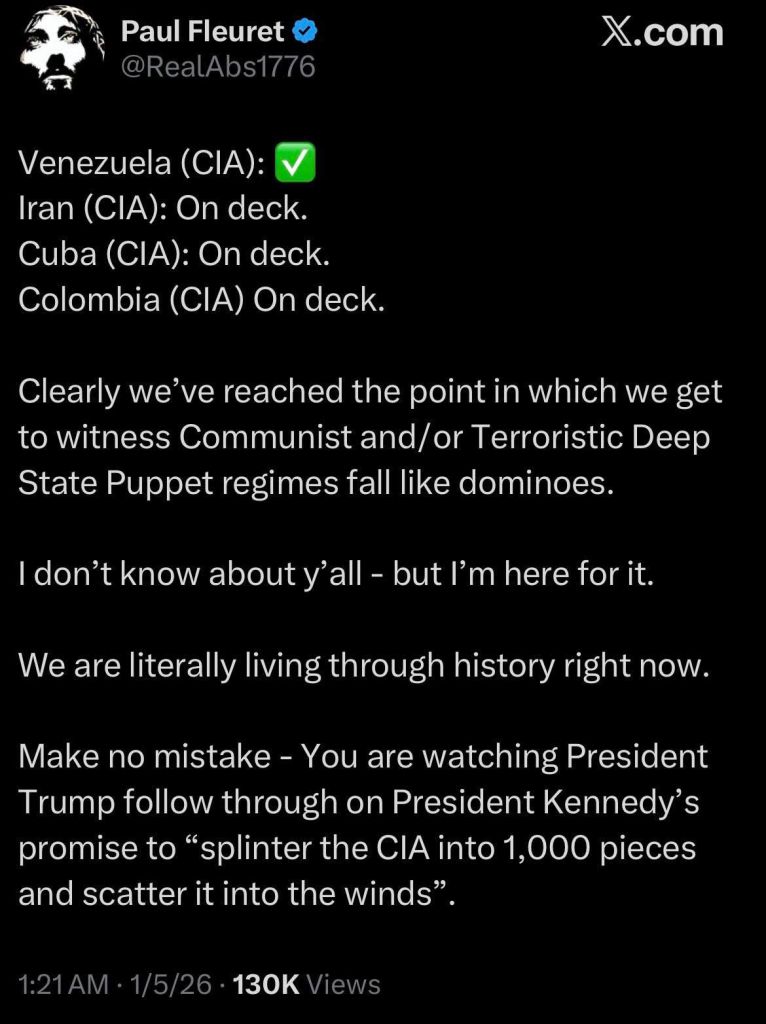 Make no mistake, you are watching President Trump follow through on President Kennedy’s promise to “splinter the CIA into 1,000 pieces and scatter it into the winds”. (facebook)