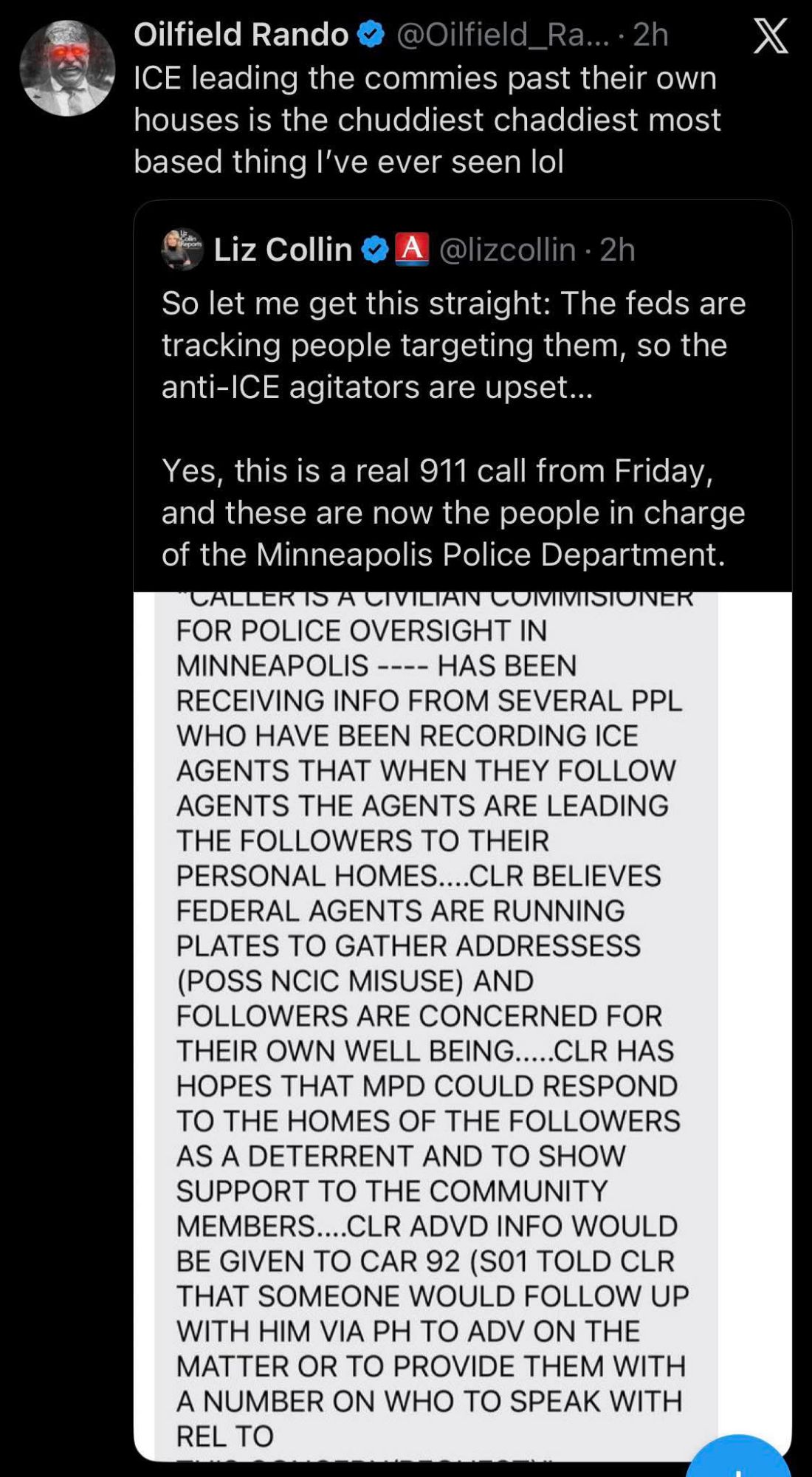 “Caller is a civilian commissioner for police oversight in Minneapolis…has been receiving info from several people who have been recording ICE agents that when they follow agents, the agents are leading the followers to their personal homes…