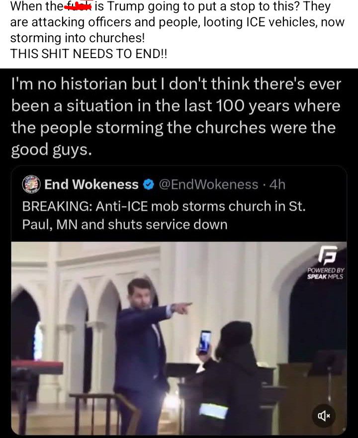 When is Trump going to put a stop to this? They are attacking officers and people, looting ICE vehicles, now storming into churches! This needs to end!!!