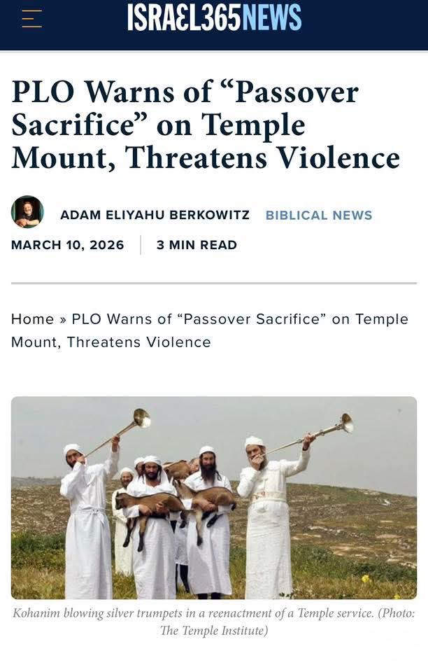 PLO Warns of “Passover Sacrifice” on Temple Mount, threatens violence: Israel 365 News …“As Passover approaches, Palestinian leaders are sounding alarms that Jews intend to carry out the Biblical Passover sacrifice on the Temple Mount. The warnings have spread through official Palestinian channels and media outlets, framing the possibility of a Jewish ritual as a dangerous provocation and a threat to the “Islamic character” of the site. The rhetoric arrives amid heightened tensions in Jerusalem and follows years of similar claims that have repeatedly inflamed violence.”