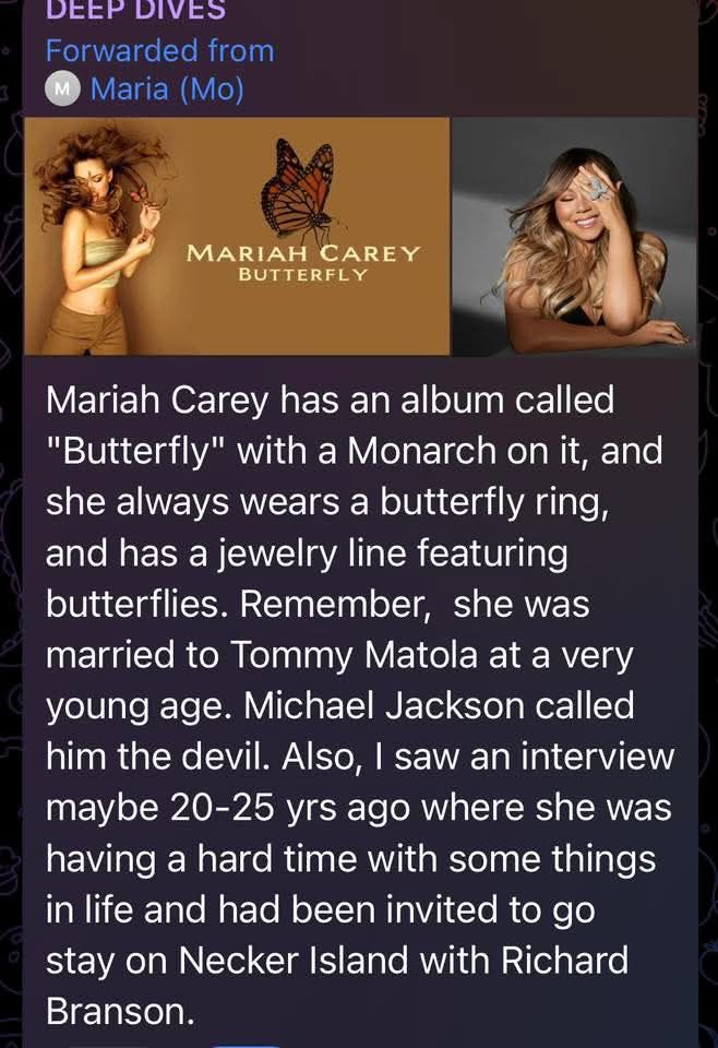 Mariah Carey has an album called “Butterfly” with a Monarch on it, she always wears a butterfly ring, and she has a jewelry line featuring butterflies. Remember, she was married to Tommy Matola at a very young age. Michael Jackson called him the devil. I saw an interview maybe 20-25 years ago where she was having a hard time and had been invited to stay on Necker Island with Richard Branson.