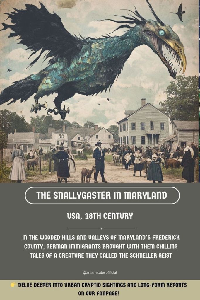 “For centuries, a large winged beast known as the Snallygaster is said to have terrified the people of Frederick County, Maryland. The dragon-like beast is described as a half-reptile and half-bird living deep in South Mountain’s caves. The mysterious creature is said to swoop silently down from the sky, stealing farm animals and children from the unsuspecting farm folk. Some say it’s real.”